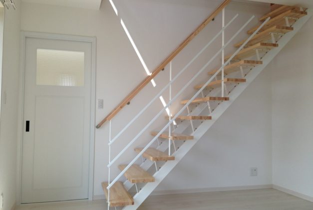LDKの一角にまるでオブジェのように設置されたHEIGデザイン階段。ナチュラルな木の色が真っ白な空間に和みを与えてくれます。