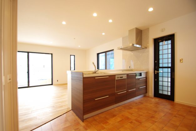 一見、タイルのように見えるキッチンの床は、クッションフロアを採用。水がこぼれてもサッと拭けてお手入れ簡単です。
