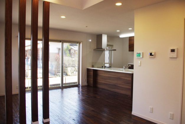 壁で塞いでしまうのではなく、格子壁でやさしく区切ることで、家族のつながりを大切にしたLDKになっています。