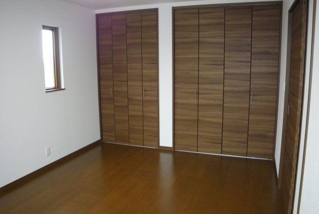 壁一面に設けたクローゼットは、用途に合わせてお使いいただける棚をご用意。床と建具を同系色でまとめ、落ち着く空間に仕上がりました。