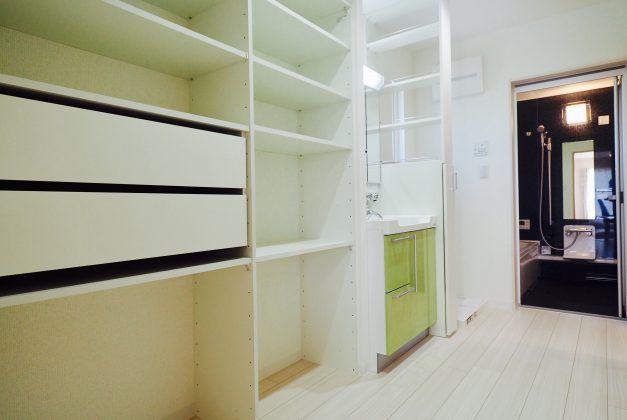 たっぷりの収納スペースを設けた洗面化粧室。室内物干もあり、家事楽です。