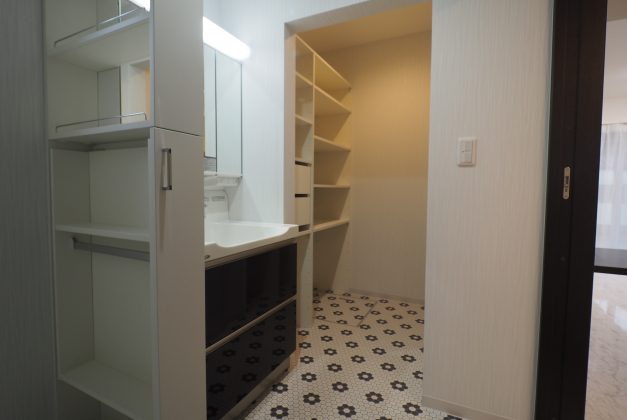 洗面所の奥には、タオルや着替えなどすぐそばにあると便利なものをたくさん収納できる棚が並んでいます。